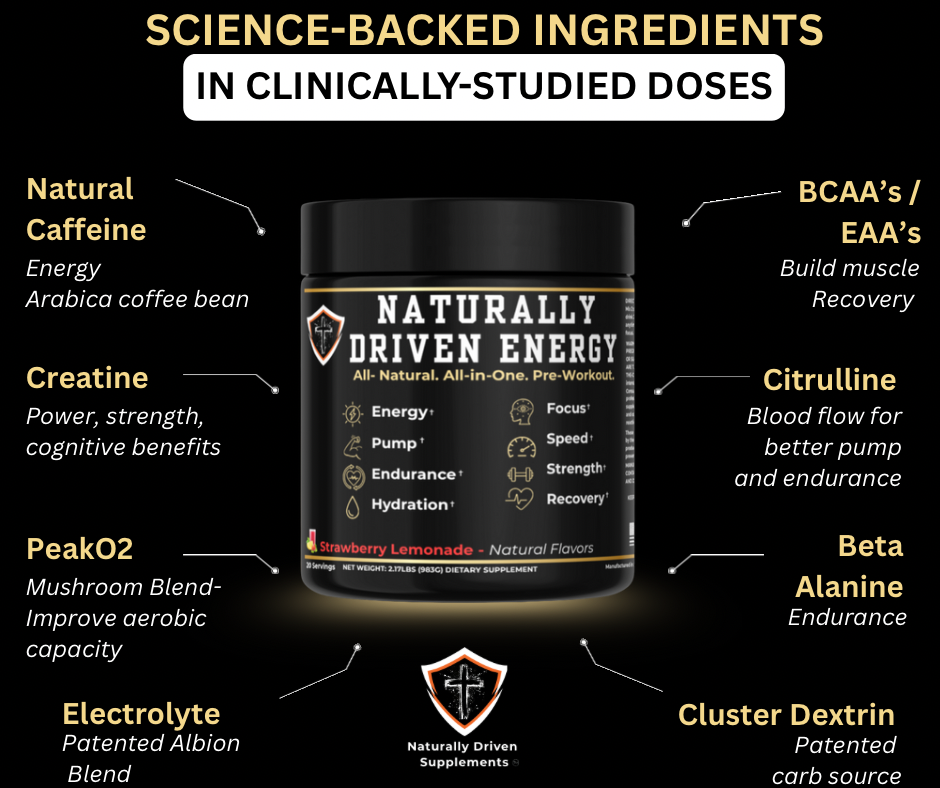 Naturally Driven Energy – The Smarter, Healthier Pre-Workout from Naturally Driven Supplements is the all-in-one pre-workout made to help you feel and perform your best without the junk. It’s 100% all-natural with no artificial colors, flavors, or sweeteners.